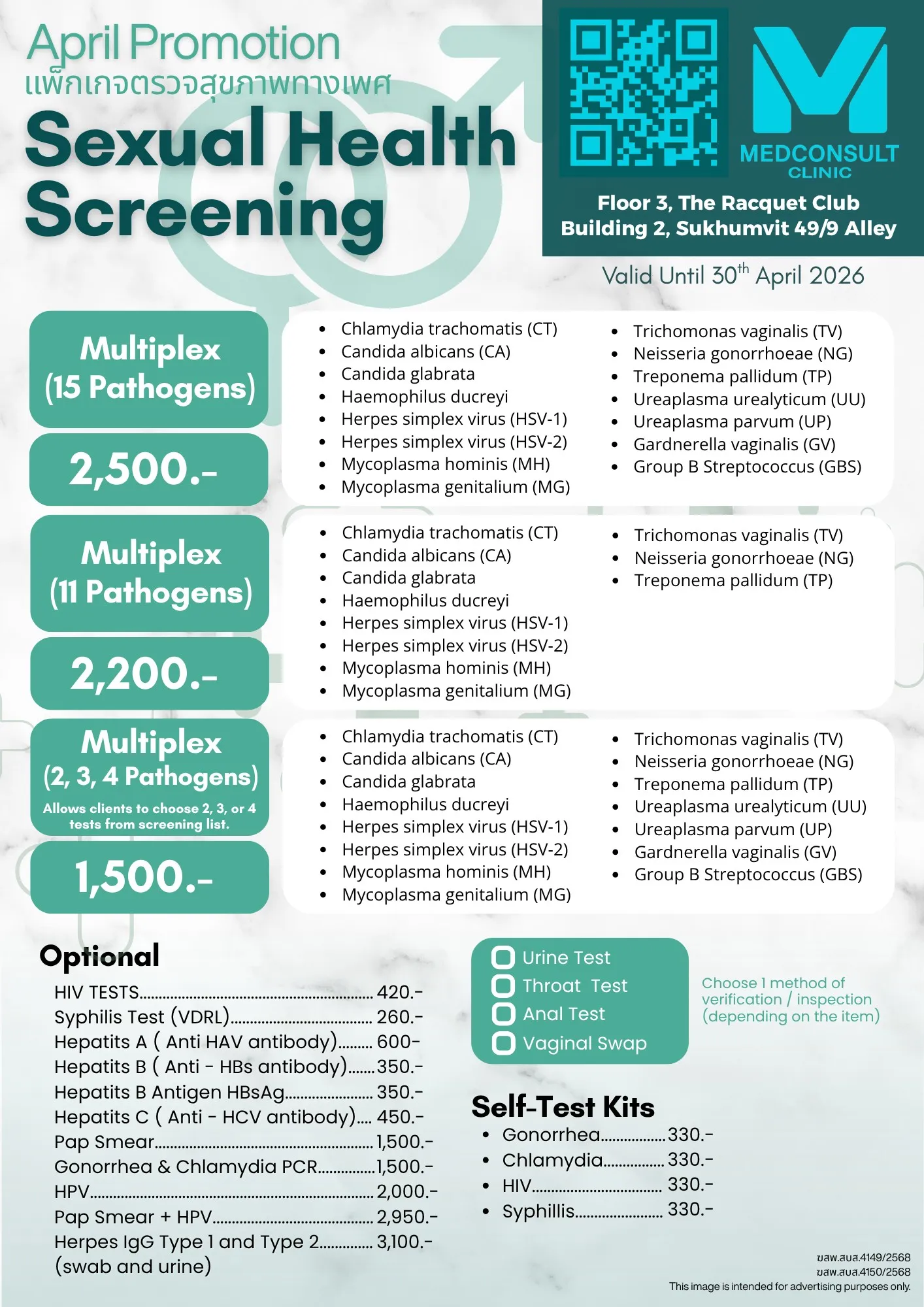 | Urine Test/Self-Test Swab (Gonorhoca &Chlamydia PCR) | 1,500฿ |