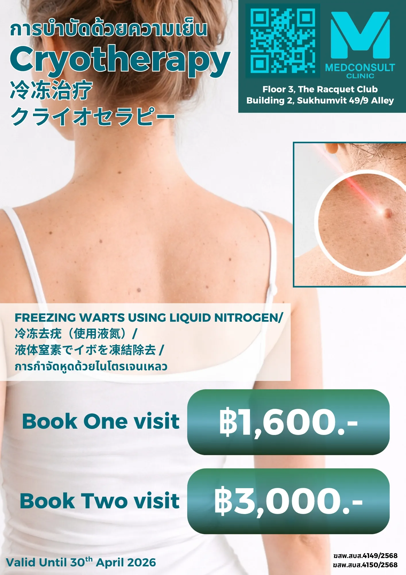 | Cryotherapy (การกำจัดหูดด้วยความเย็น) 1 visit | 1,600฿ |